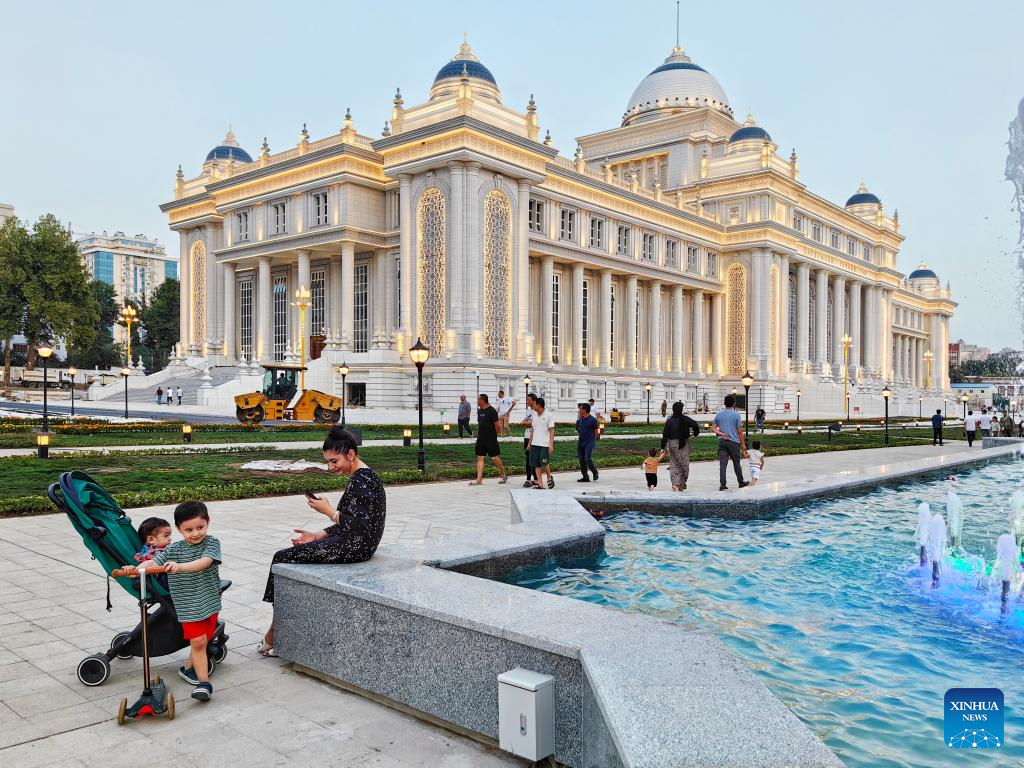 People spend their leisure time in front of the parliament hall in Dushanbe, Tajikistan, June 29, 2024. Tajikistan is located in the southeast of Central Asia, with a mountainous area exceeding 90 percent of its total area. Dushanbe is the capital of Tajikistan and the country's economic and cultural center. (Xinhua/Shen Hong)