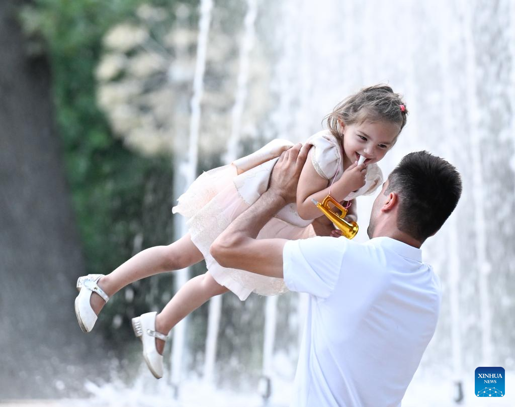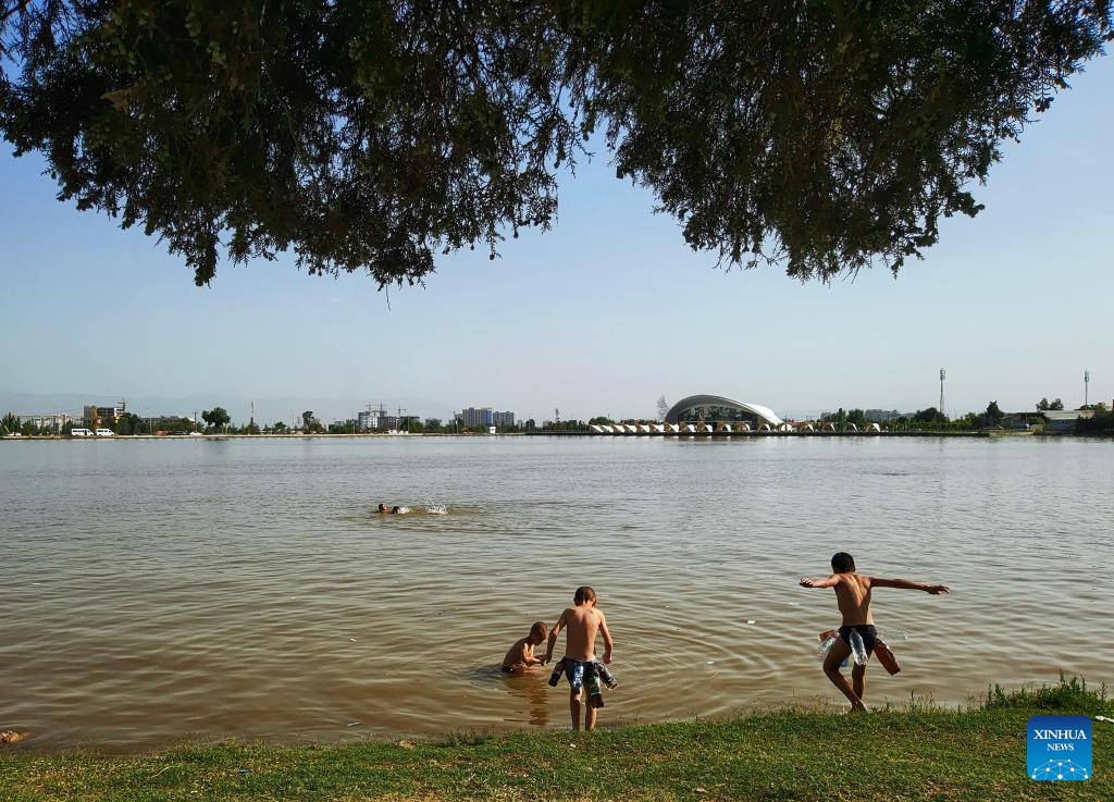 Children play in water in Dushanbe, Tajikistan, July 3, 2024. Tajikistan is located in the southeast of Central Asia, with a mountainous area exceeding 90 percent of its total area. Dushanbe is the capital of Tajikistan and the country's economic and cultural center. (Xinhua/Yan Yan)