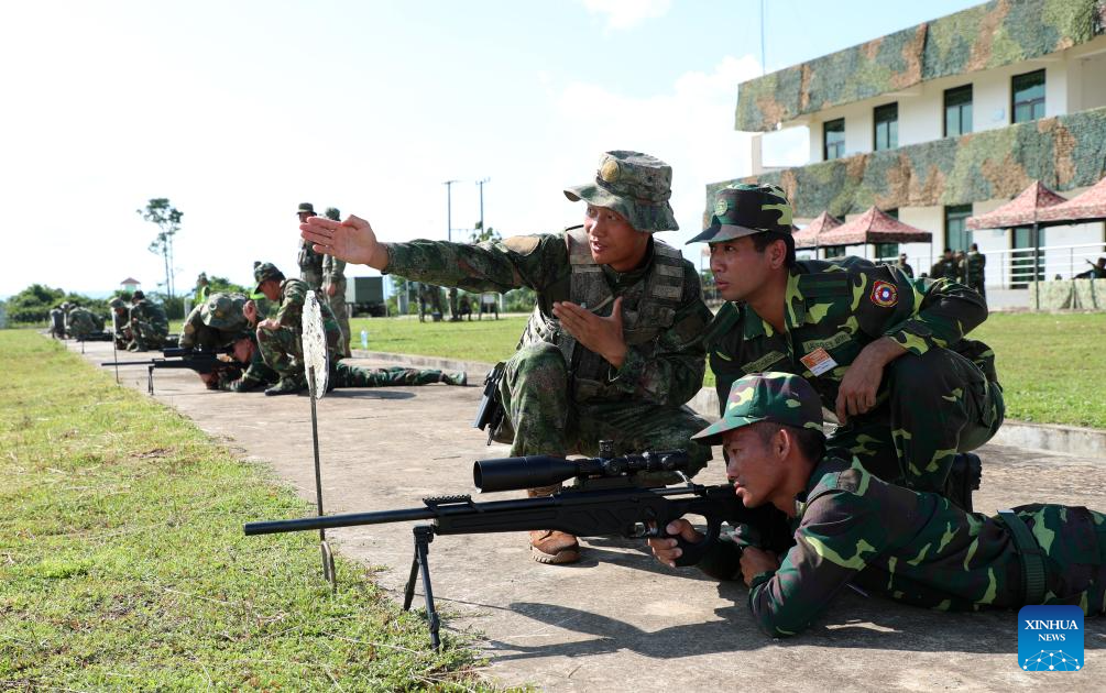 Soldiers from Chinese military and Laos military exercise together at the Kommadam Academy of the Lao People's Armed Forces (LPAF) in Laos, July 8, 2024.
