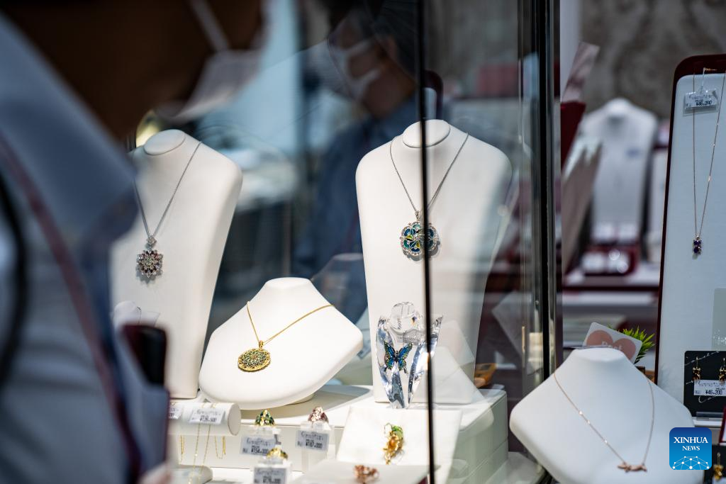 A customer visits TOKYO JEWELRY FES in Tokyo, Japan, July 12, 2024. The event is held here from July 12 to 14, attracting about 250 exhibitors. (Xinhua/Zhang Xiaoyu)