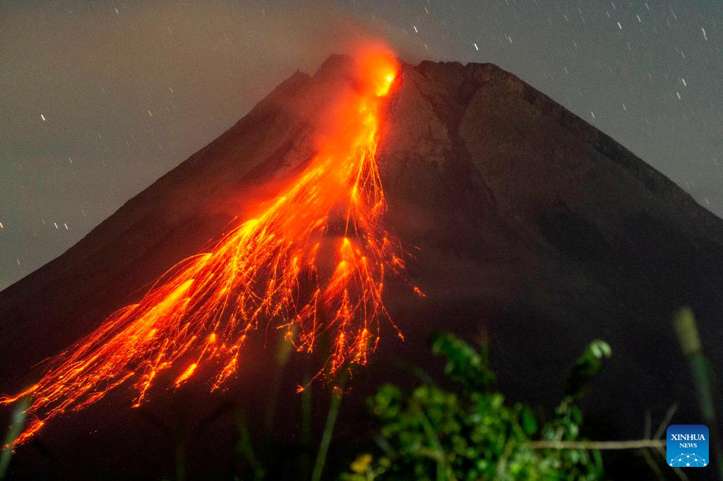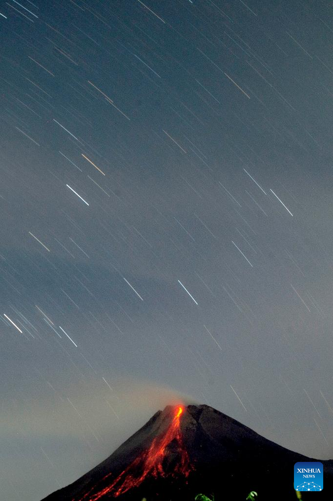 The long exposure photo shows volcanic materials spewing from Mount Merapi seen from Tunggul Arum village in Sleman, Yogyakarta, Indonesia, July 12, 2024. (Photo by Agung Supriyanto/Xinhua)