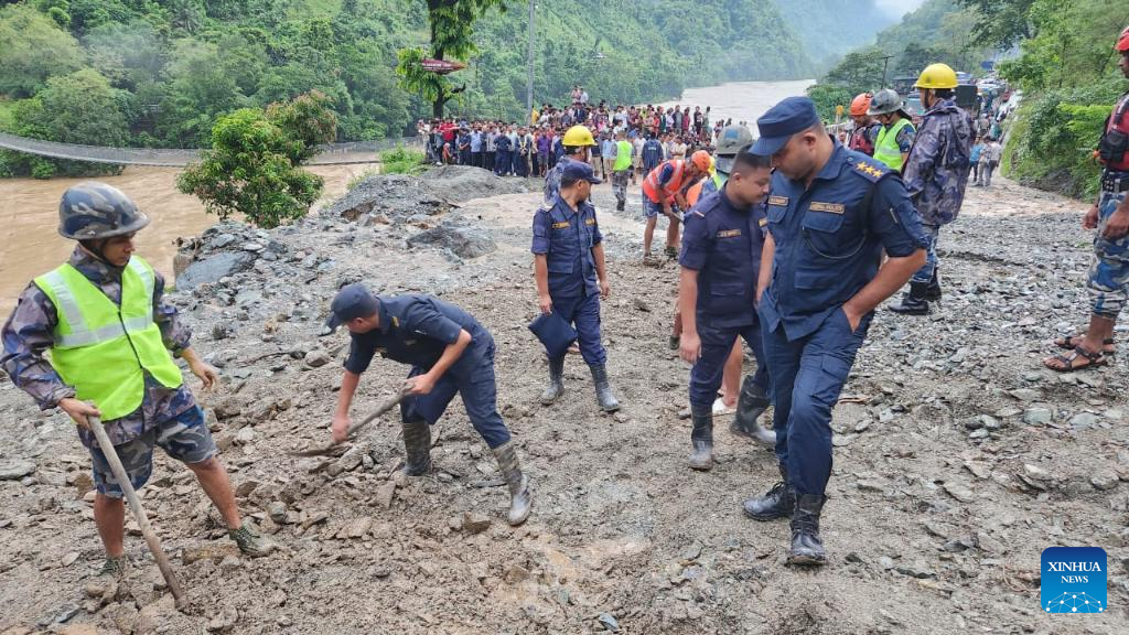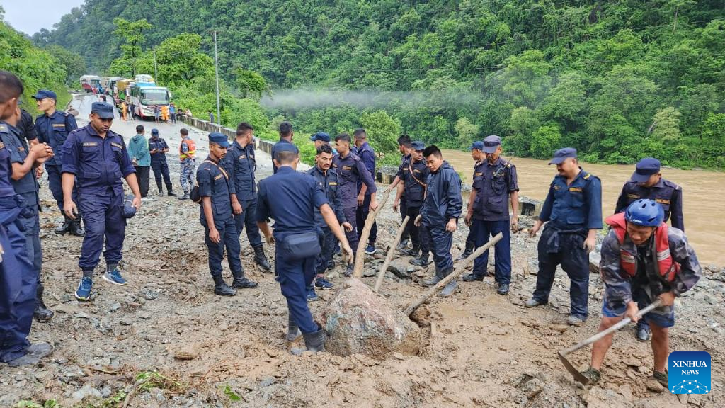Police officers work at the site of a landslide in Chitwan, Nepal, July 12, 2024. A total of 65 passengers went missing after two buses were swept away by landslides in Chitwan district on the Mugling-Narayanghat stretch of a highway that connects Kathmandu with the rest of the country. (Nepal Police/Handout via Xinhua)