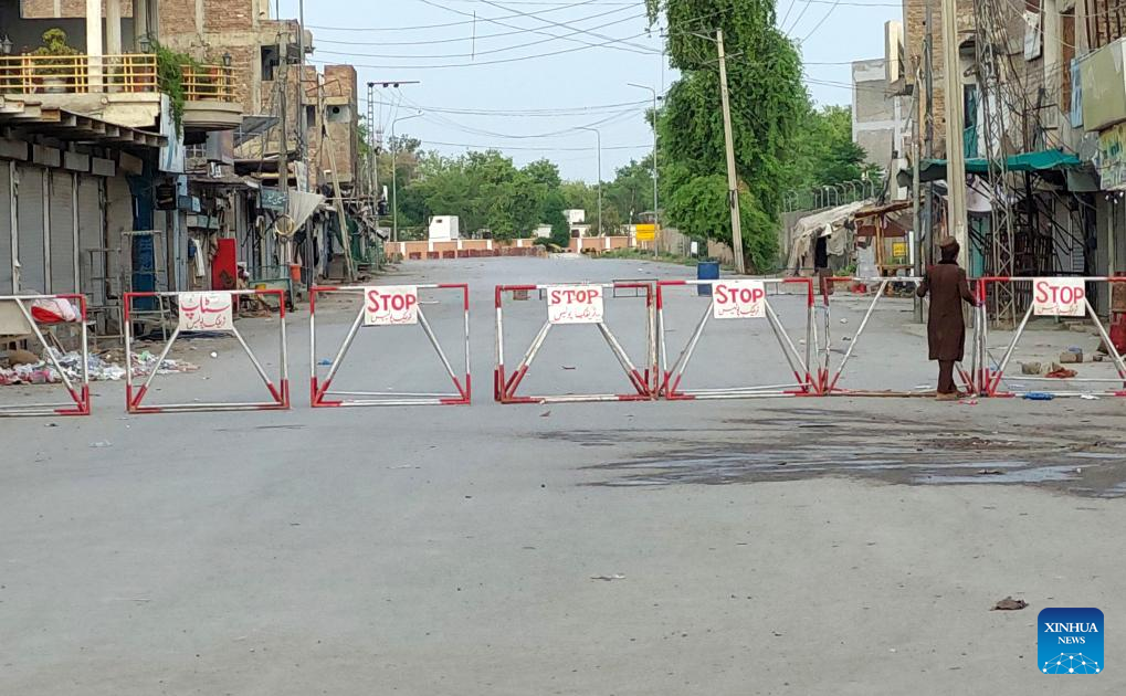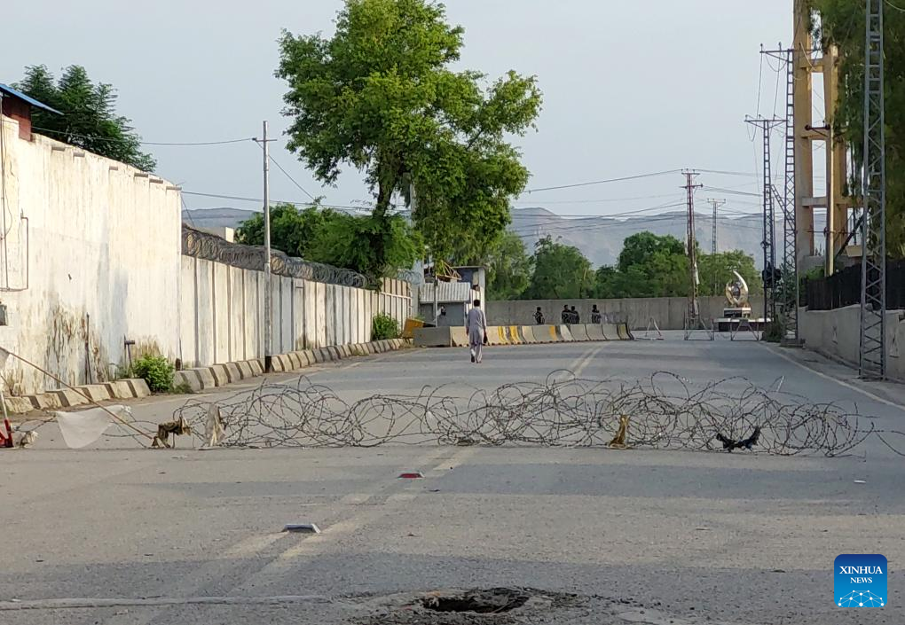 This photo taken on July 16, 2024 shows a street blocked with barricades near the site following an attack on an army base in the Bannu district of Khyber Pakhtunkhwa province, Pakistan. Eight troops and 10 terrorists were killed in an attack on an army base in Pakistan's northwest Khyber Pakhtunkhwa province, a military statement said on Tuesday. (Str/Xinhua)
