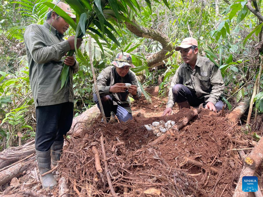 This photo taken on May 25, 2024 shows conservationists spotting Siamese crocodile eggs in Koh Kong province, Cambodia. Five nests of nearly-extinct Siamese crocodiles have been discovered in Cambodia's Cardamom National Park, which is the largest number of nests ever found in more than 20 years, a conservationist group said in a joint press release on Thursday. (Hor Leng/Fauna & Flora/Handout via Xinhua)