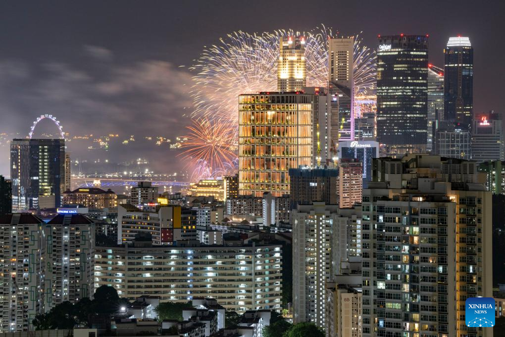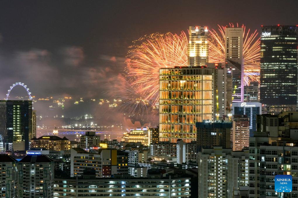 Fireworks light up the sky during the rehearsal of Singapore's National Day Parade in Marina Bay, Singapore, July 20, 2024. (Photo by Then Chih Wey/Xinhua)