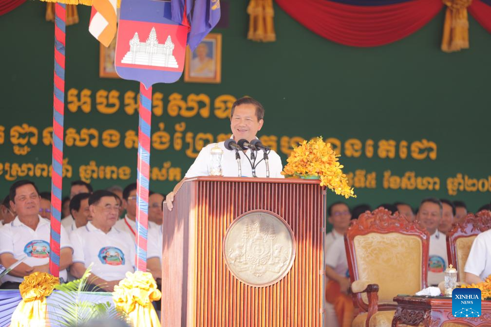 Cambodian Prime Minister Hun Manet speaks during the groundbreaking ceremony for the Funan Techo Canal in Kandal province, Cambodia, Aug. 5, 2024. Cambodia on Monday began to build the 1.7-billion-U.S. dollar Funan Techo Canal, connecting the Mekong River's Preak Takeo tributary in southern Kandal province to the sea in southwestern Kep province. (Photo by Ly Lay/Xinhua)
