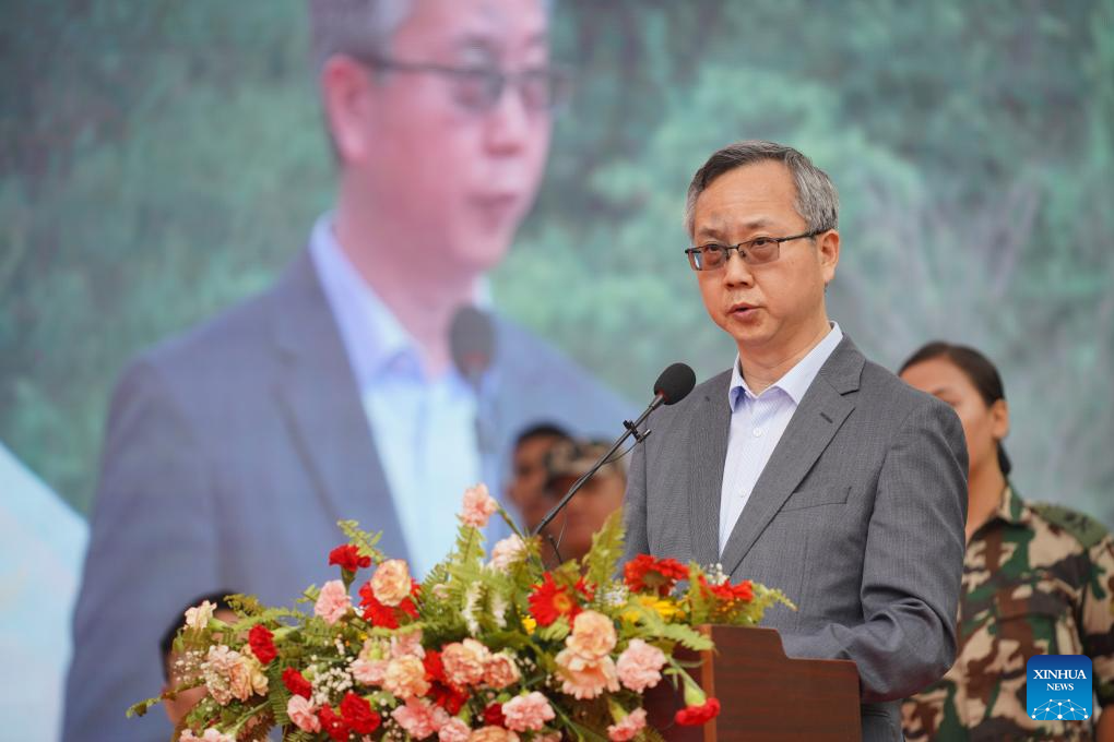 Chinese Ambassador to Nepal Chen Song addresses the breakthrough ceremony held at the construction site of Nepal's major fast-track package 2 project in Makwanpur district of Nepal, Aug. 5, 2024. The last tunnel was broken through on Monday for the package 2 project contracted by a Chinese company under the Kathmandu-Terai/Madhesh fast track project, which Nepali Prime Minister KP Sharma Oli described as an "important milestone" toward achieving Nepal's development goals. (Photo by Hari Maharjan/Xinhua)