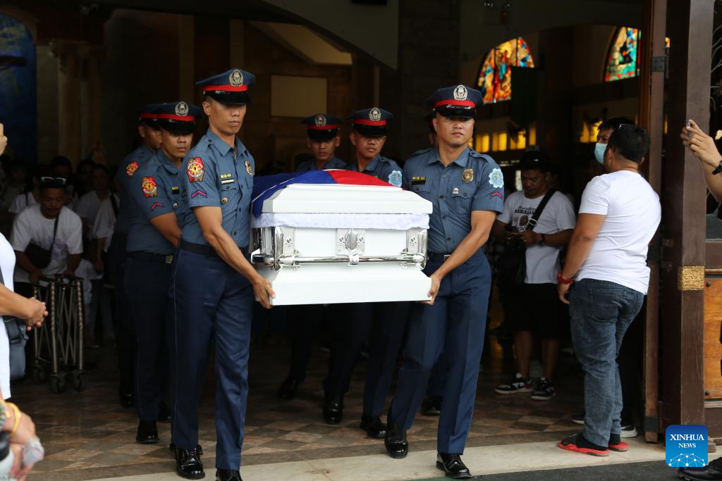 The coffin of the late Philippine police officer Nelson G. Santiago is carried to the graveyard at Teresa town in Rizal province, the Philippines, Aug. 10, 2024. The funeral of Philippine police officer Nelson G. Santiago, who lost his life in a rescue operation for two abducted Chinese nationals, was held Saturday at Teresa town in Rizal province, east of Manila.