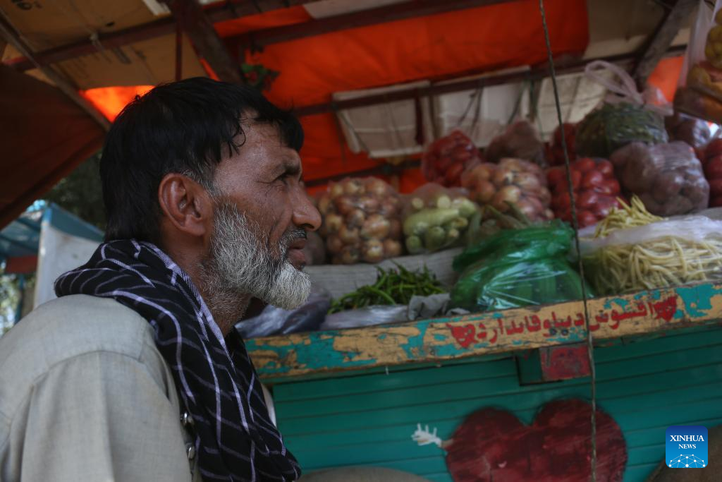 KABUL, Aug. 15 (Xinhua) -- After one day of business slump, Mohammadajan, a street vendor in Afghanistan's capital Kabul, was taking the last opportunity to tout vegetables to sparse shoppers loudly before sunset.
