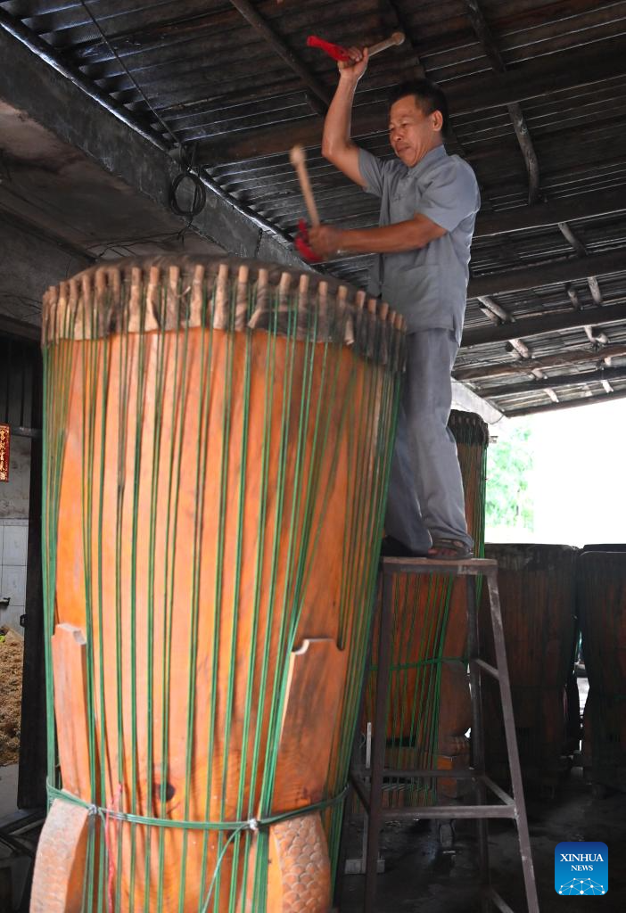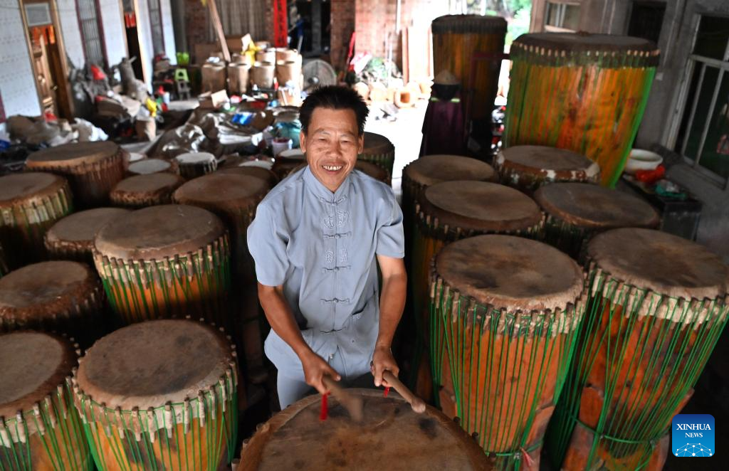 Shi Shaohan, an inheritor of Yandun drum making technique, beats a drum in Lingshan County, south China's Guangxi Zhuang Autonomous Region, Aug. 15, 2024.