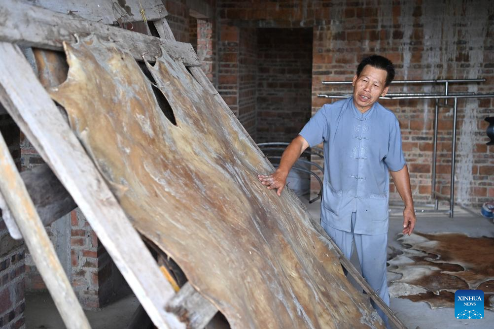 Shi Shaohan, an inheritor of Yandun drum making technique, checks a piece of dried cowhide before making a drum in Lingshan County, south China's Guangxi Zhuang Autonomous Region, Aug. 15, 2024.