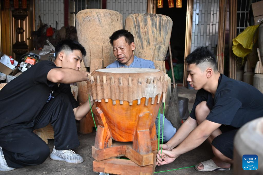 Shi Shaohan (C), an inheritor of Yandun drum making technique, teaches his grandsons to make a drum in Lingshan County, south China's Guangxi Zhuang Autonomous Region, Aug. 15, 2024.