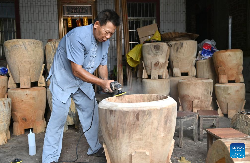 Shi Shaohan, an inheritor of Yandun drum making technique, polishes wood to make a drum in Lingshan County, south China's Guangxi Zhuang Autonomous Region, Aug. 15, 2024.