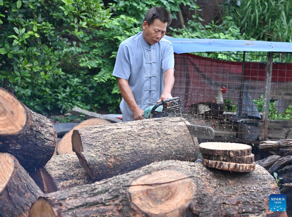 Shi Shaohan, an inheritor of Yandun drum making technique, cuts wood with a saw to make a drum in Lingshan County, south China's Guangxi Zhuang Autonomous Region, Aug. 15, 2024.