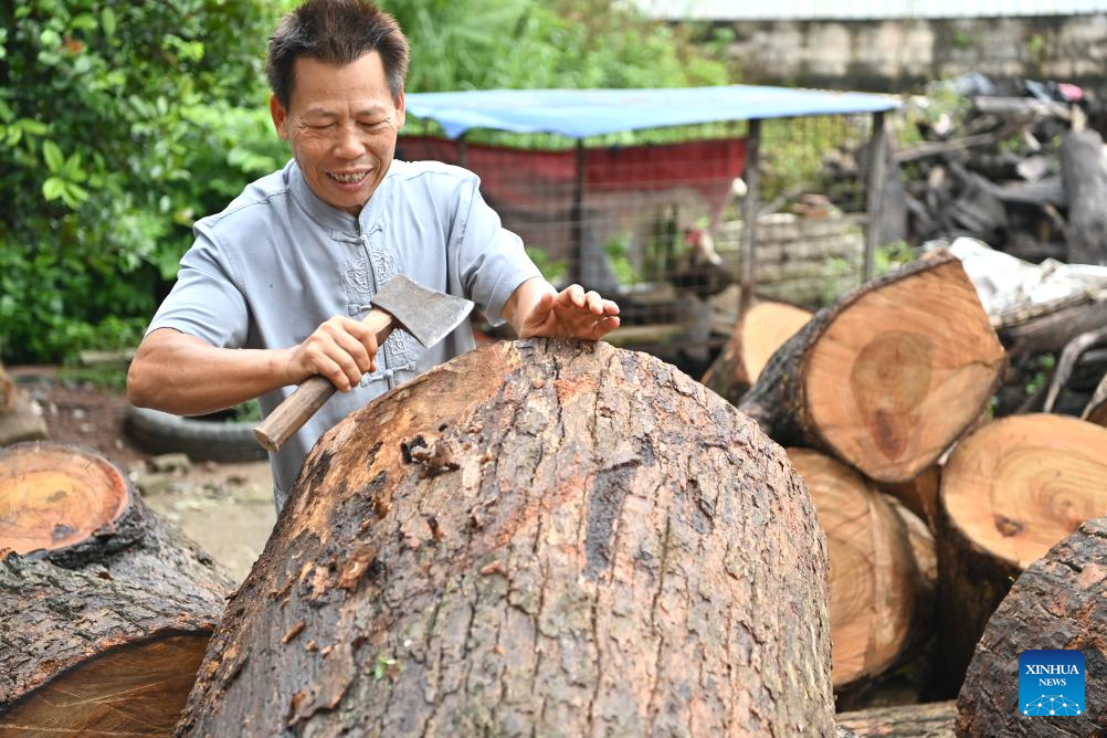 Shi Shaohan, an inheritor of Yandun drum making technique, peels wood to make a drum in Lingshan County, south China's Guangxi Zhuang Autonomous Region, Aug. 15, 2024.