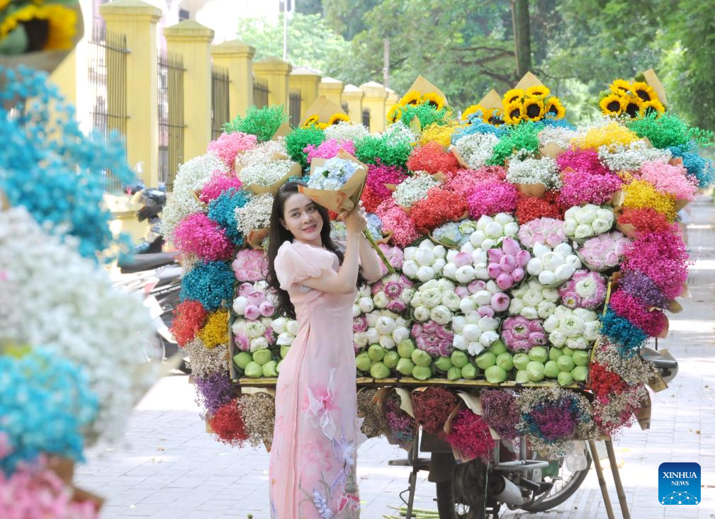 A woman dressed in Vietnamese traditional long dress Ao Dai poses for a photo at a flower stall in Hanoi, Vietnam, Aug. 16, 2024. (Xinhua/Liu Tian)