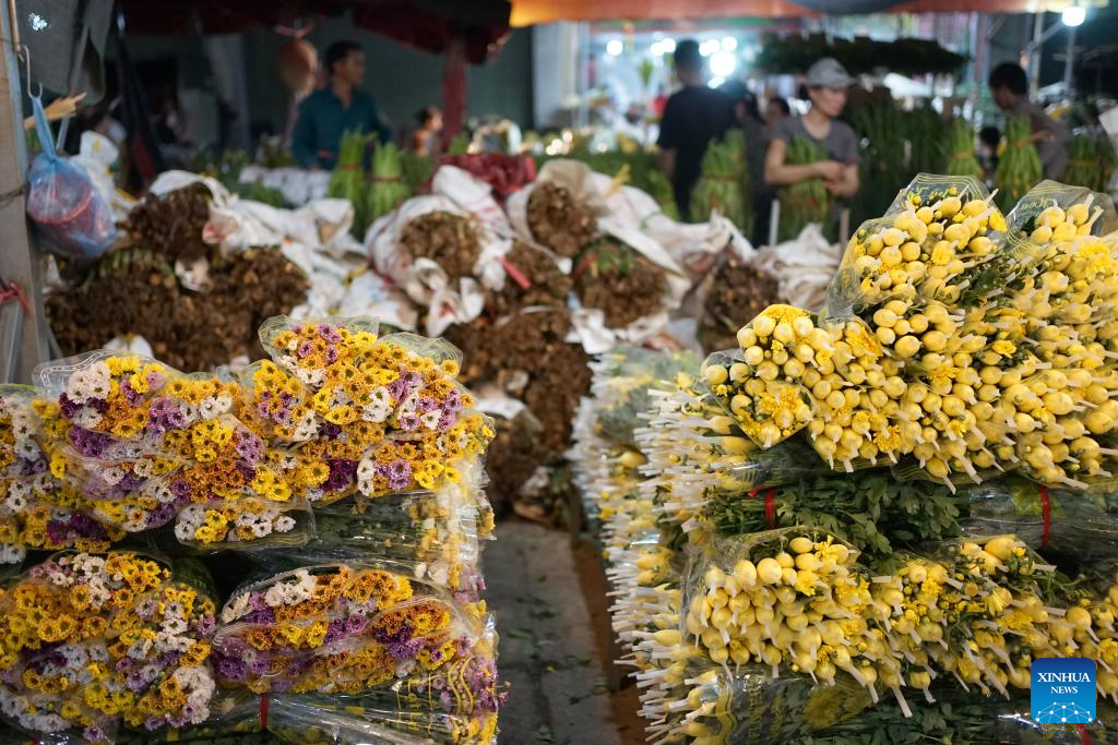 This photo taken on Aug. 15, 2024 shows flowers for sale at a wholesale market in Hanoi, Vietnam. (Xinhua/Hu Jiali)