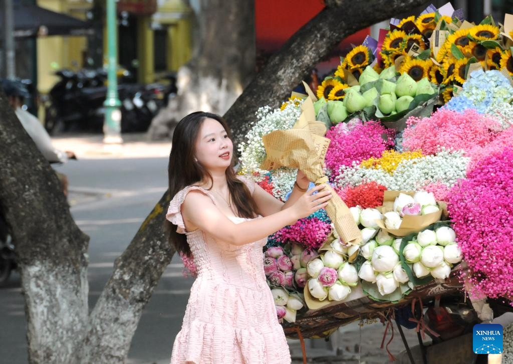 A woman buys flowers at a flower stall in Hanoi, Vietnam, Aug. 16, 2024. (Xinhua/Liu Tian)