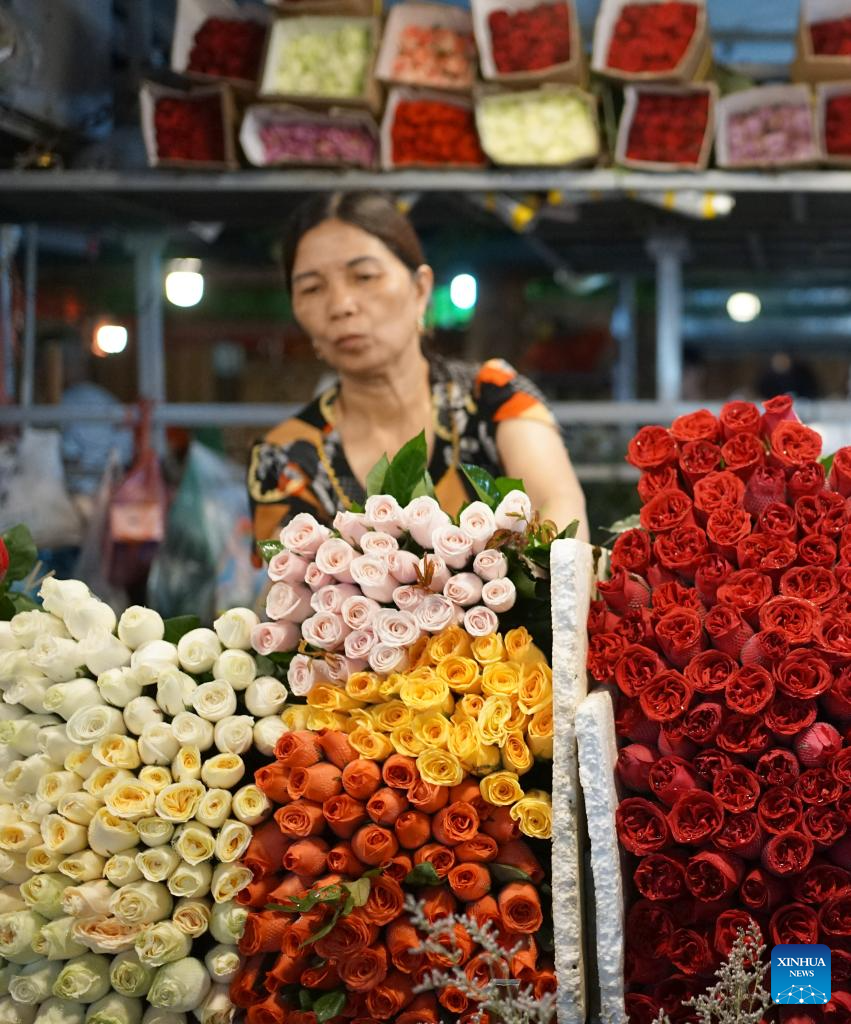 A vendor arranges her flowers at a wholesale market in Hanoi, Vietnam, Aug. 15, 2024. (Xinhua/Hu Jiali)