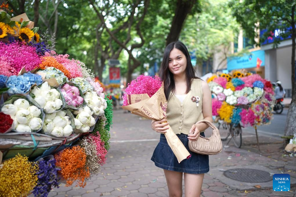 A woman buys flowers at a flower stall in Hanoi, Vietnam, Aug. 16, 2024. (Xinhua/Hu Jiali)
