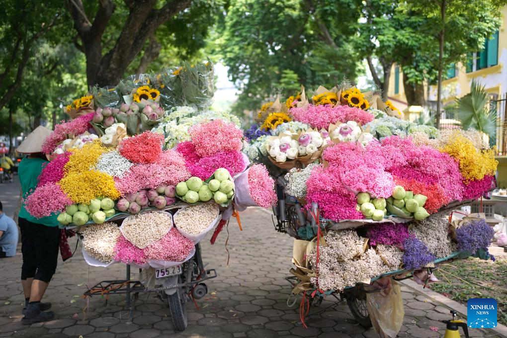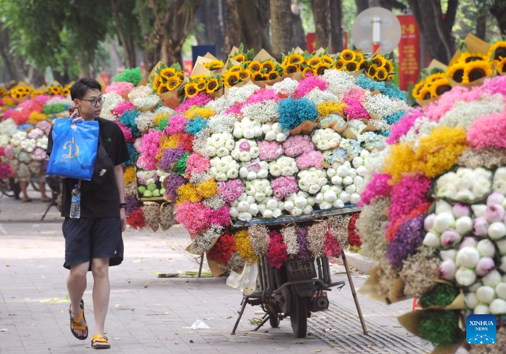 Flower stalls line the street in Hanoi, Vietnam, Aug. 16, 2024. (Xinhua/Liu Tian)