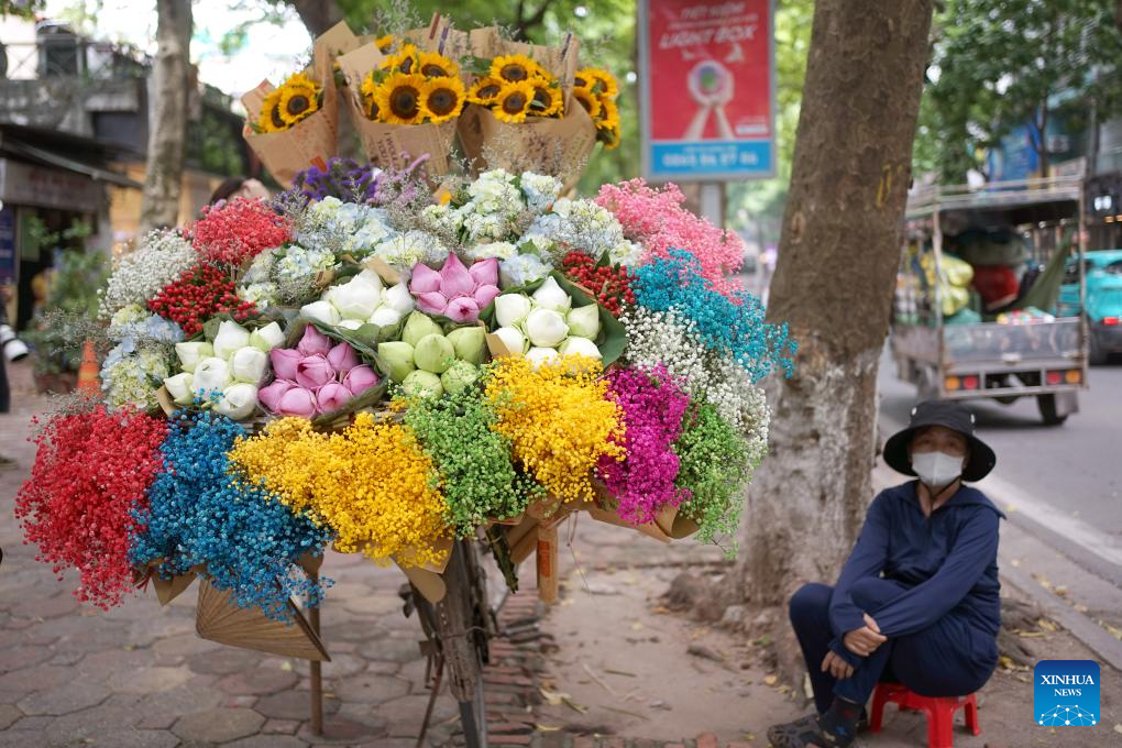 A woman selling flowers sits beside her stall in Hanoi, Vietnam, Aug. 16, 2024. (Xinhua/Hu Jiali)