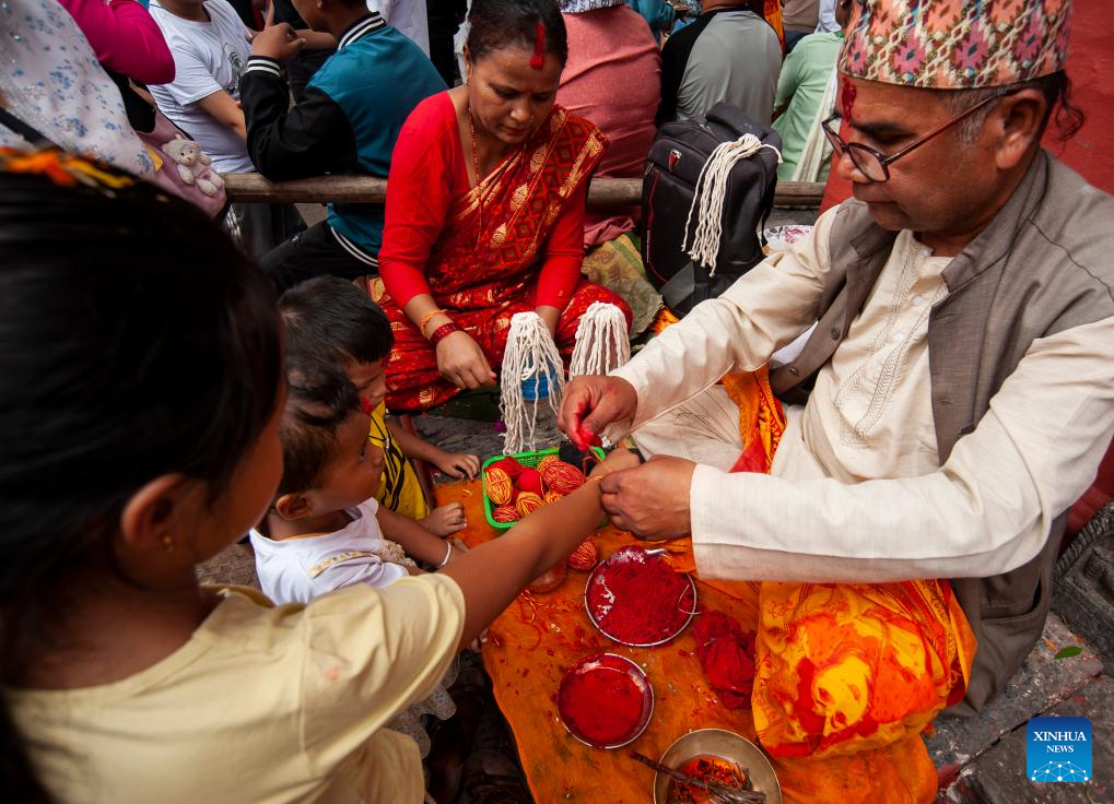 A priest ties a sacred string to a girl during the Janai Purnima festival in Lalitpur, Nepal, Aug. 19, 2024. (Photo by Hari Maharjan/Xinhua)