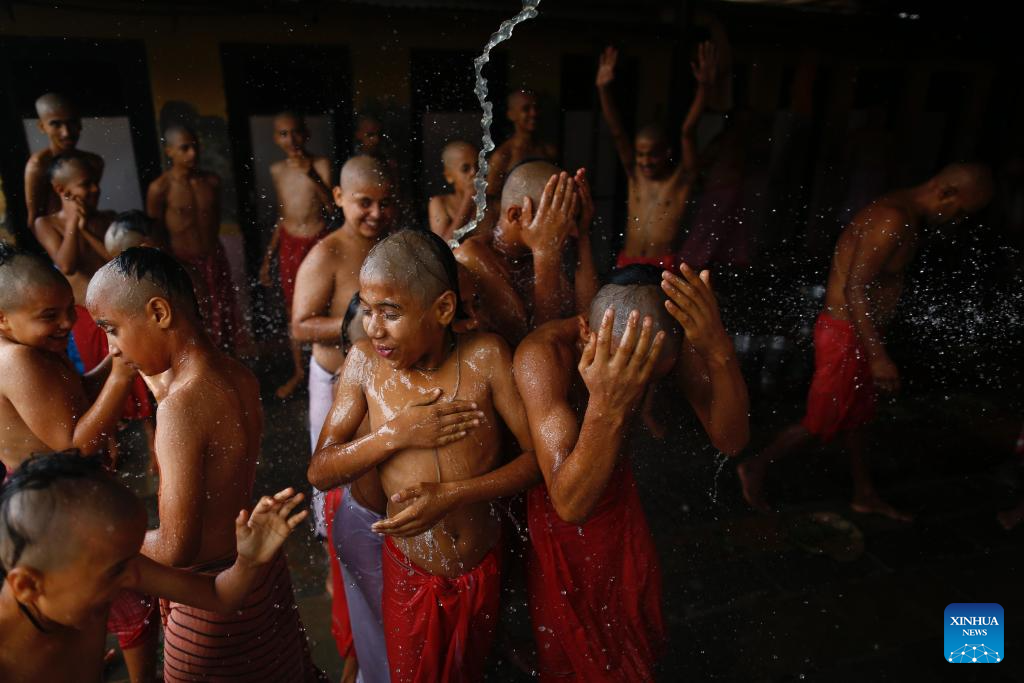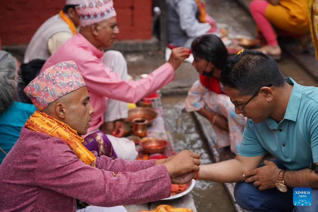 Students perform a ritual during the Janai Purnima festival at the Pashupatinath Temple in Kathmandu, Nepal, Aug. 19, 2024. (Photo by Sulav Shrestha/Xinhua)