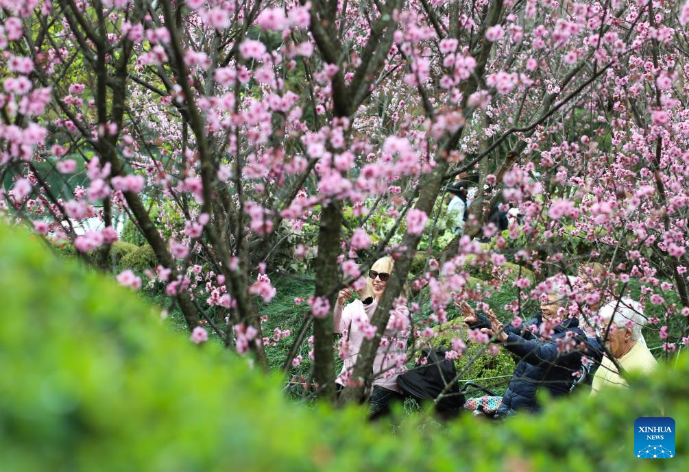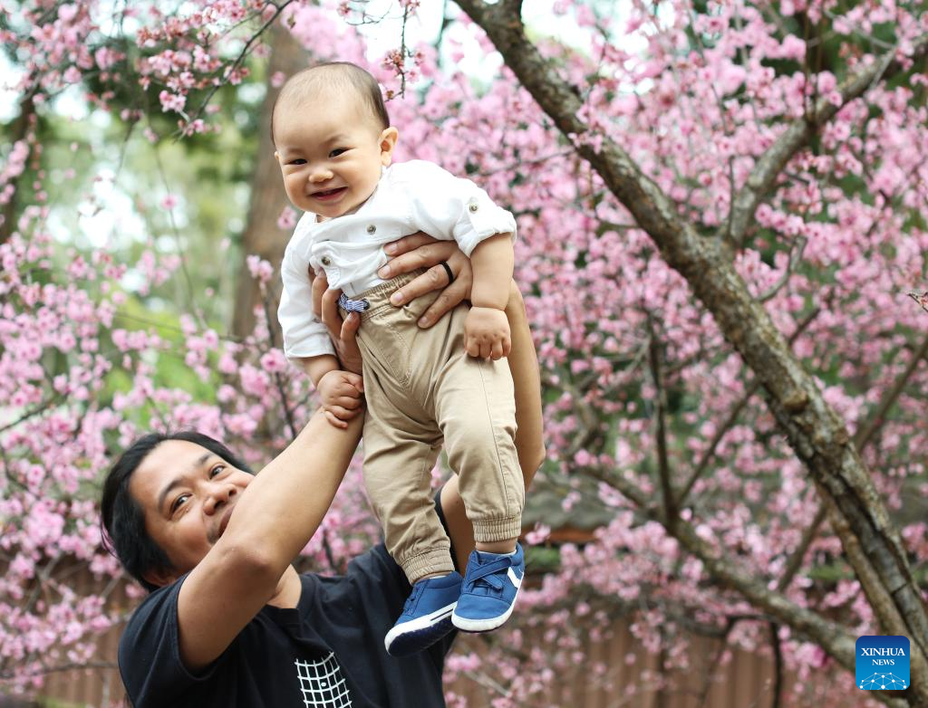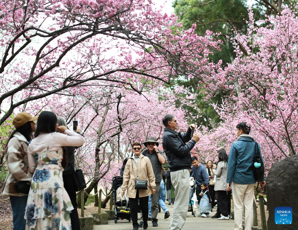 Visitors enjoy cherry blossoms during the Sydney Cherry Blossom Festival 2024 at the Auburn Botanic Gardens in Sydney, Australia, Aug. 19, 2024. (Xinhua/Ma Ping)