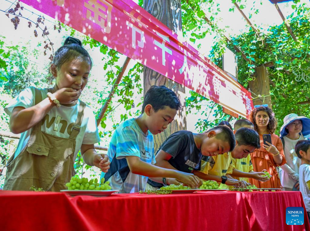 Tourists participate in a grape eating contest in the Grape Valley in Turpan, northwest China's Xinjiang Uygur Autonomous Region, Aug. 17, 2024.