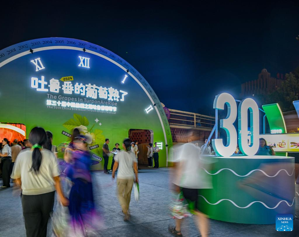 People walk to the venue of the opening ceremony of the 30th China Silk Road Turpan Grape Festival in Turpan, northwest China's Xinjiang Uygur Autonomous Region, Aug. 16, 2024.