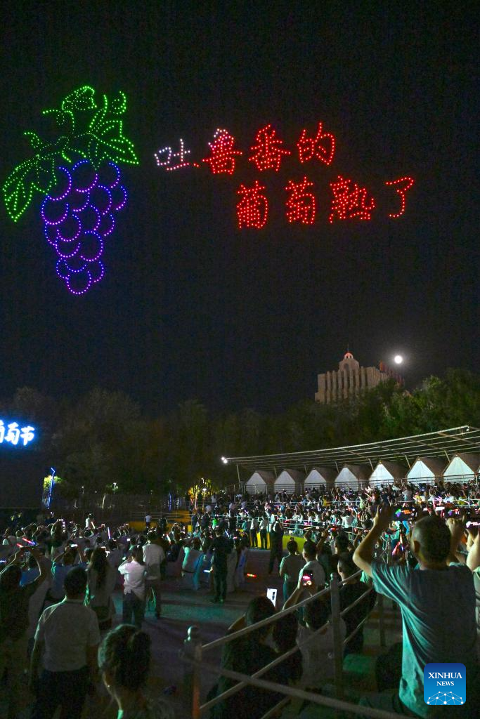 People watch a drone light show during the opening ceremony of the 30th China Silk Road Turpan Grape Festival in Turpan, northwest China's Xinjiang Uygur Autonomous Region, Aug. 16, 2024.
