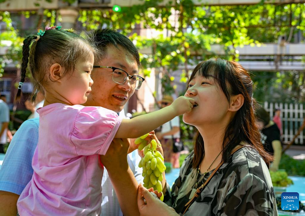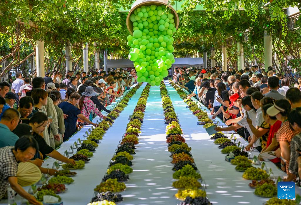 The three-day Turpan grape festival kicked off on Friday. With its dry and sunny climate, Turpan has a long history of growing grapes and is one of the main grape production bases in China. Its planting area totals 42,000 hectares with 550 grape varieties. (Xinhua/Chen Shuo)