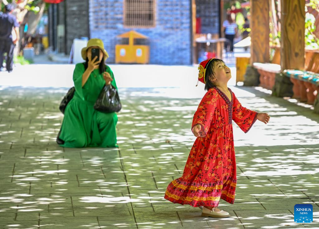A child poses for photos in the Grape Valley in Turpan, northwest China's Xinjiang Uygur Autonomous Region, Aug. 17, 2024.