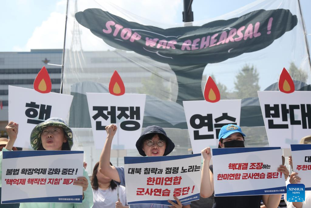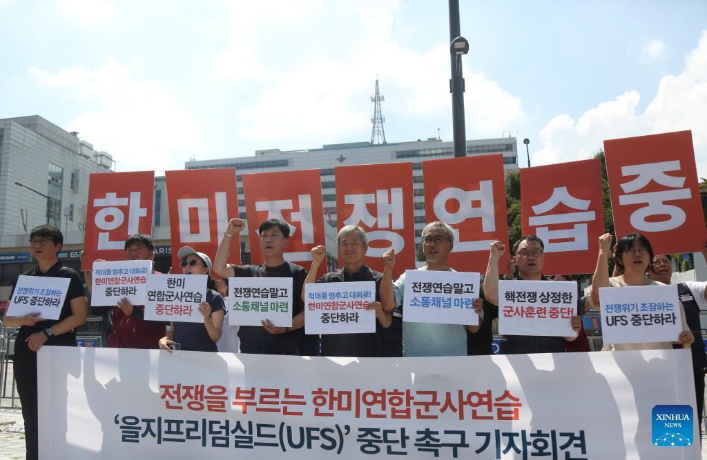 SEOUL, Aug. 19 (Xinhua) -- South Korean peace groups held a protest rally Monday against the Asian country's joint military exercise with the United States, which they said has boosted confrontation and war crisis on and around the Korean Peninsula.