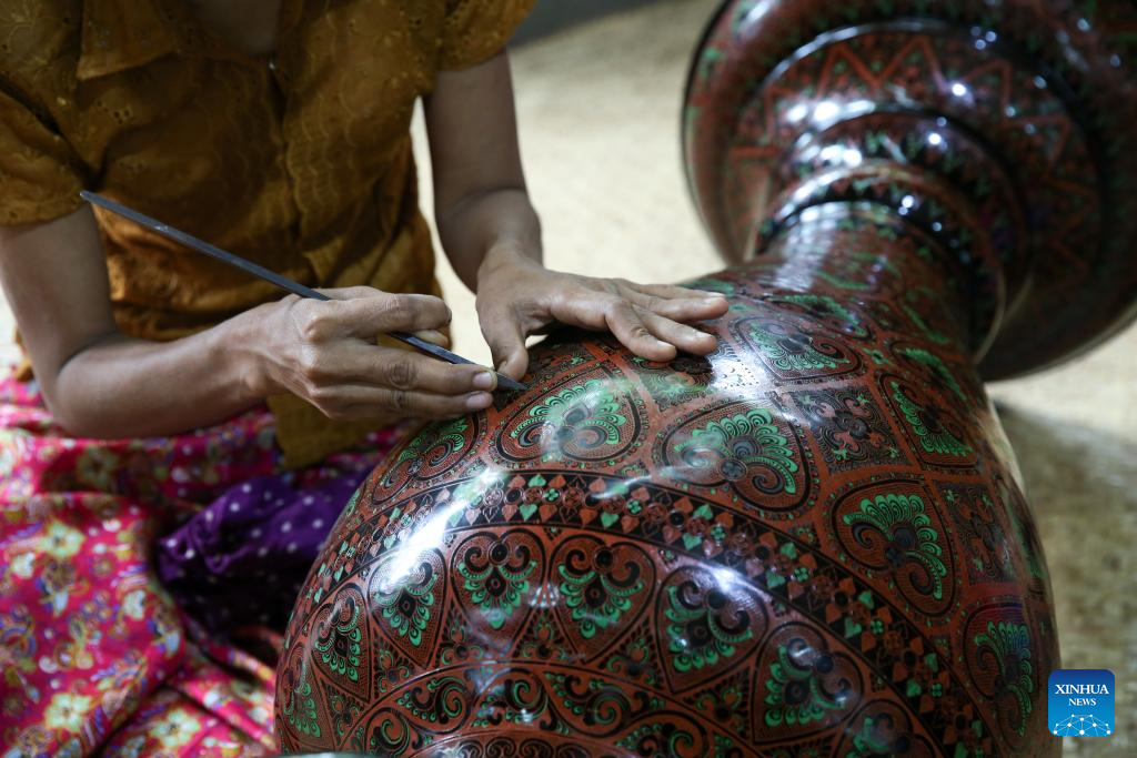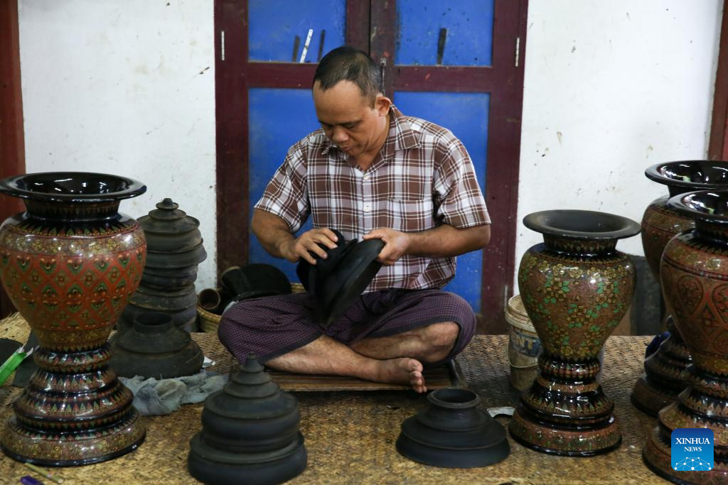 A man works on a lacquerware at a workshop in Bagan, Myanmar, Aug. 24, 2024. (Xinhua/Myo Kyaw Soe)