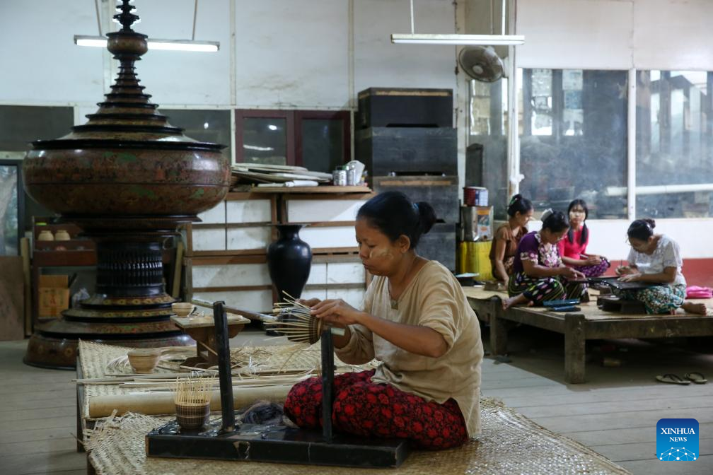 Workers make lacquerwares at a workshop in Bagan, Myanmar, Aug. 24, 2024. (Xinhua/Myo Kyaw Soe)