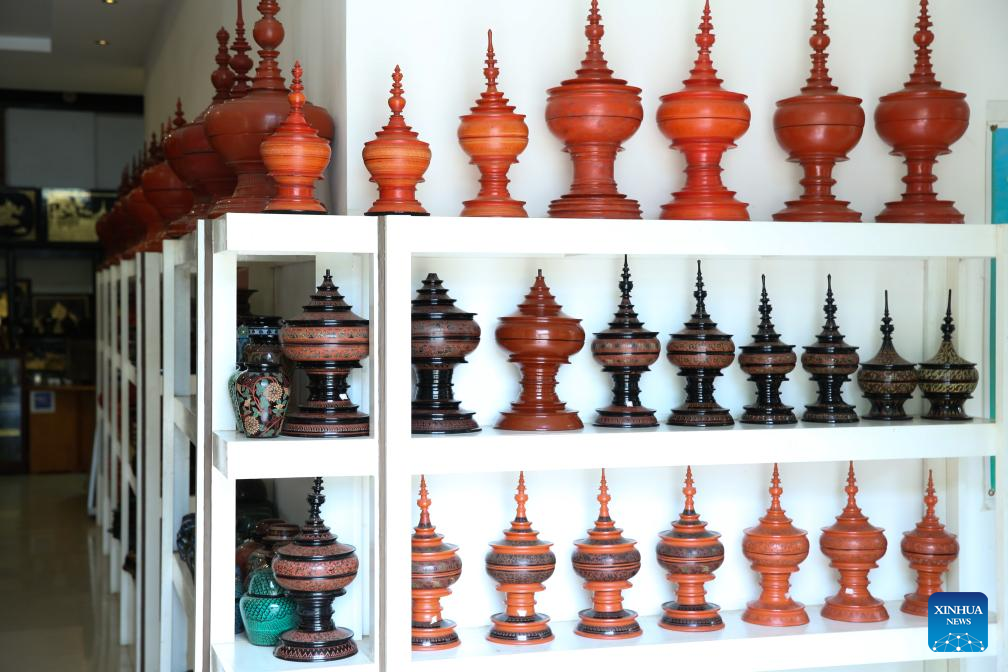 This photo taken on Aug. 24, 2024 shows colorful lacquerwares at a shop in Bagan, Myanmar, Aug. 24, 2024. (Xinhua/Myo Kyaw Soe)