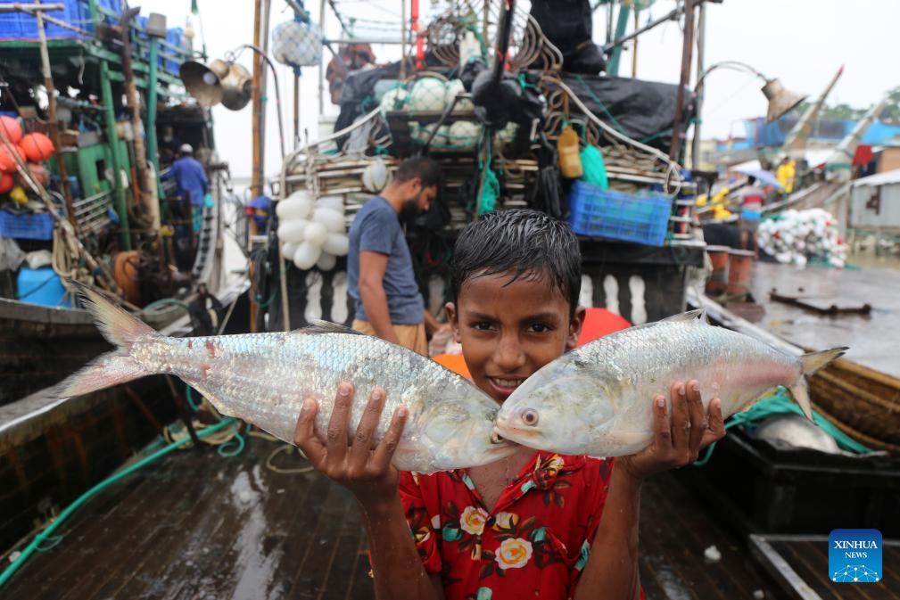 A boy shows Hilsa fish in Patuakhali, Bangladesh, Aug. 24, 2024. Bangladeshi fishermen in Patuakhali has become busy with hilsa recently after a 65-day fishing ban period. (Xinhua)