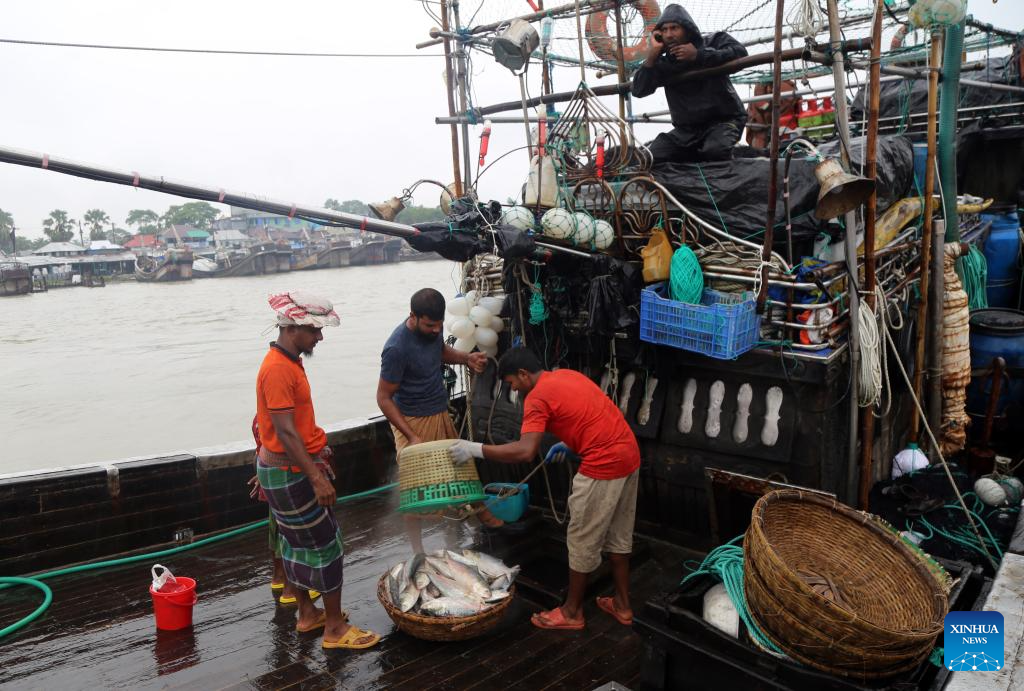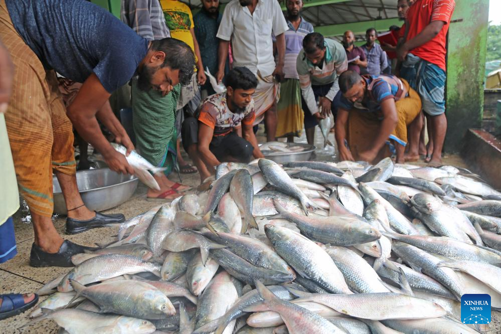 Workers process Hilsa fish at a fish landing station in Patuakhali, Bangladesh, Aug. 24, 2024. Bangladeshi fishermen in Patuakhali has become busy with hilsa recently after a 65-day fishing ban period. (Xinhua)
