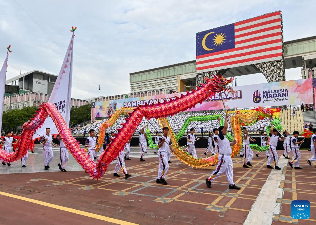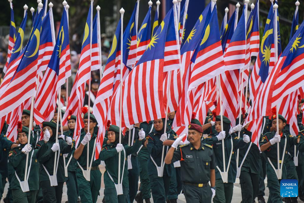 People take part in the National Day celebration rehearsal in Putrajaya, Malaysia, Aug. 29, 2024. Malaysia's National Day celebration will take place on Aug. 31. (Photo by Chong Voon Chung/Xinhua)