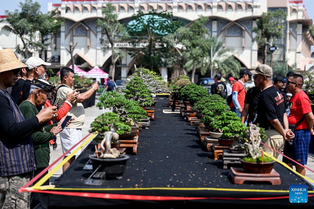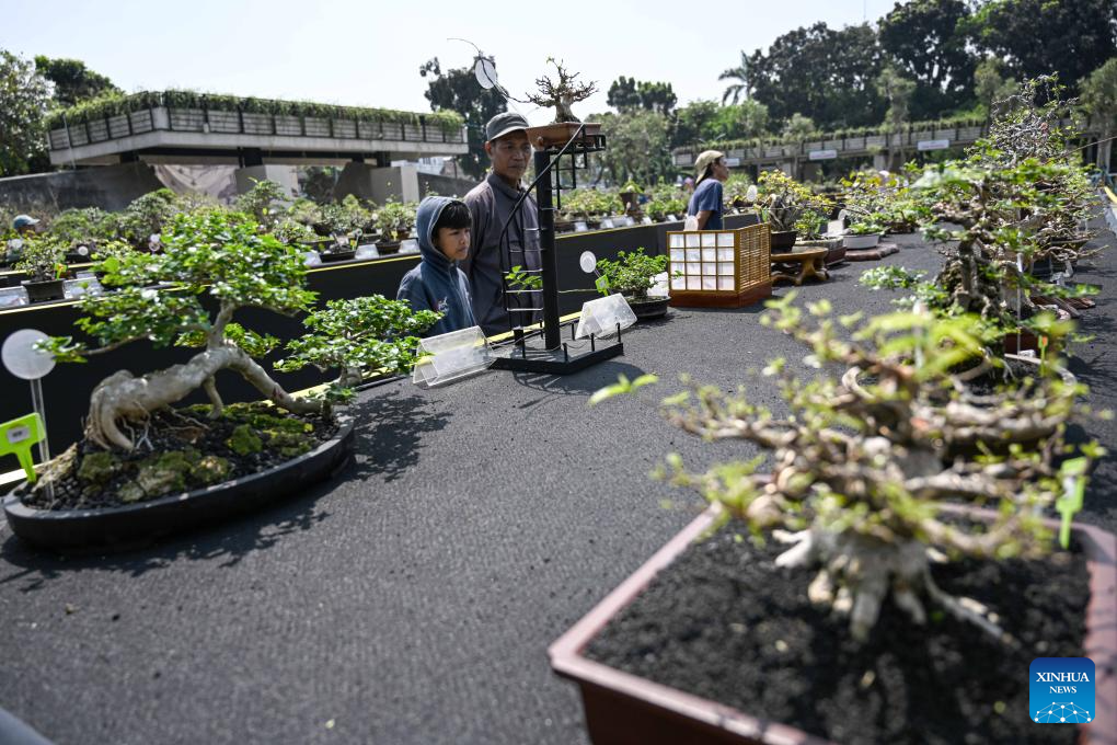 Visitors view bonsai works displayed at a regional bonsai exhibition in Pamulang, South Tangerang, Indonesia, Sept. 1, 2024. (Xinhua/Agung Kuncahya B.)