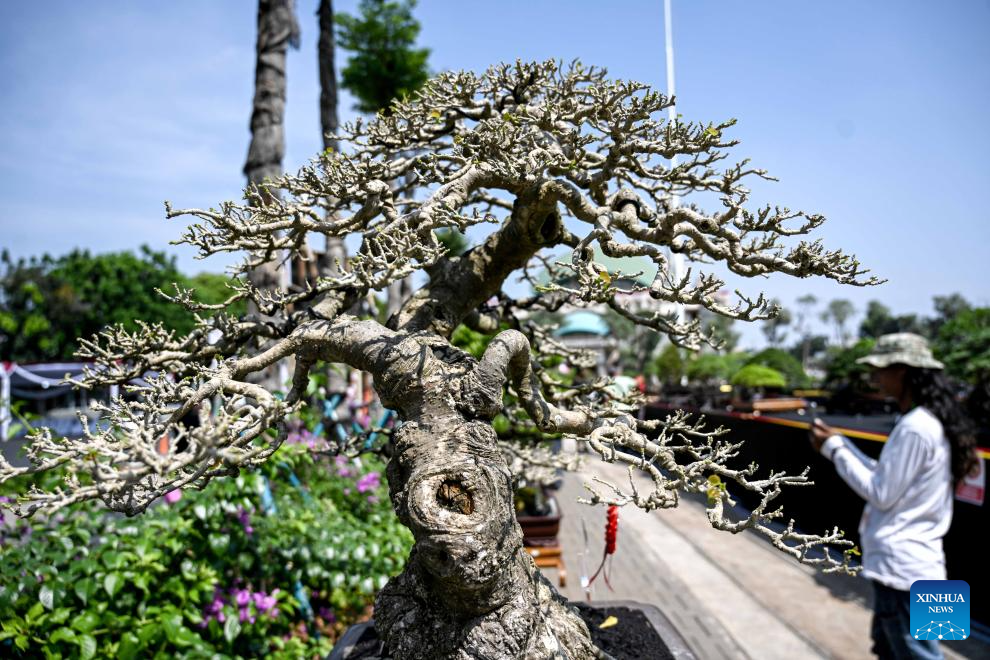 A visitor views bonsai works displayed at a regional bonsai exhibition in Pamulang, South Tangerang, Indonesia, Sept. 1, 2024. (Xinhua/Agung Kuncahya B.)