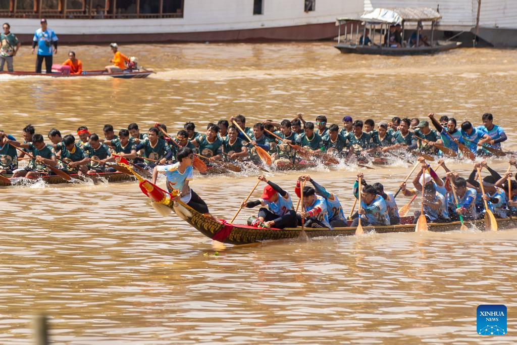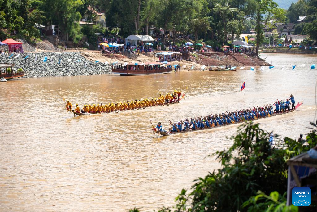 People participate in an annual dragon boat racing festival in Luang Prabang, Laos, Sept. 2, 2024. (Photo by Kaikeo Saiyasane/Xinhua)