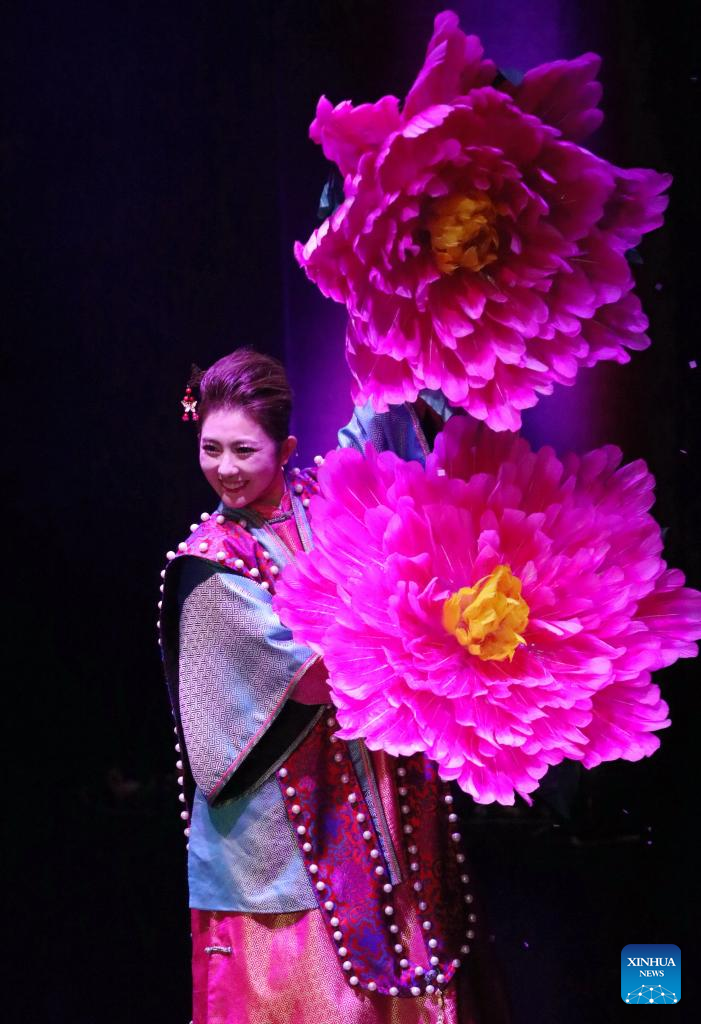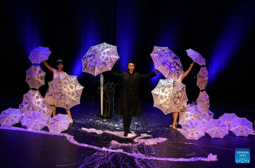 A Chinese magician performs traditional Chinese magic during the Chinese Magic New Zealand Tour in Wellington, New Zealand, Sept. 13, 2024. Top Chinese magicians have embarked on a performance tour in New Zealand to display the mystique of the traditional face-changing, levitation, and other Chinese intangible cultural heritages, for a spectacular visual feast. (Photo by Meng Tao/Xinhua)