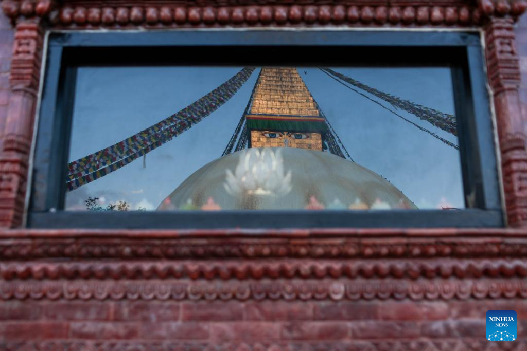 Boudhanath Stupa, a UNESCO heritage site, is reflected in a window pane in Kathmandu, Nepal, Sept. 7, 2024. (Photo by Sulav Shrestha/Xinhua)