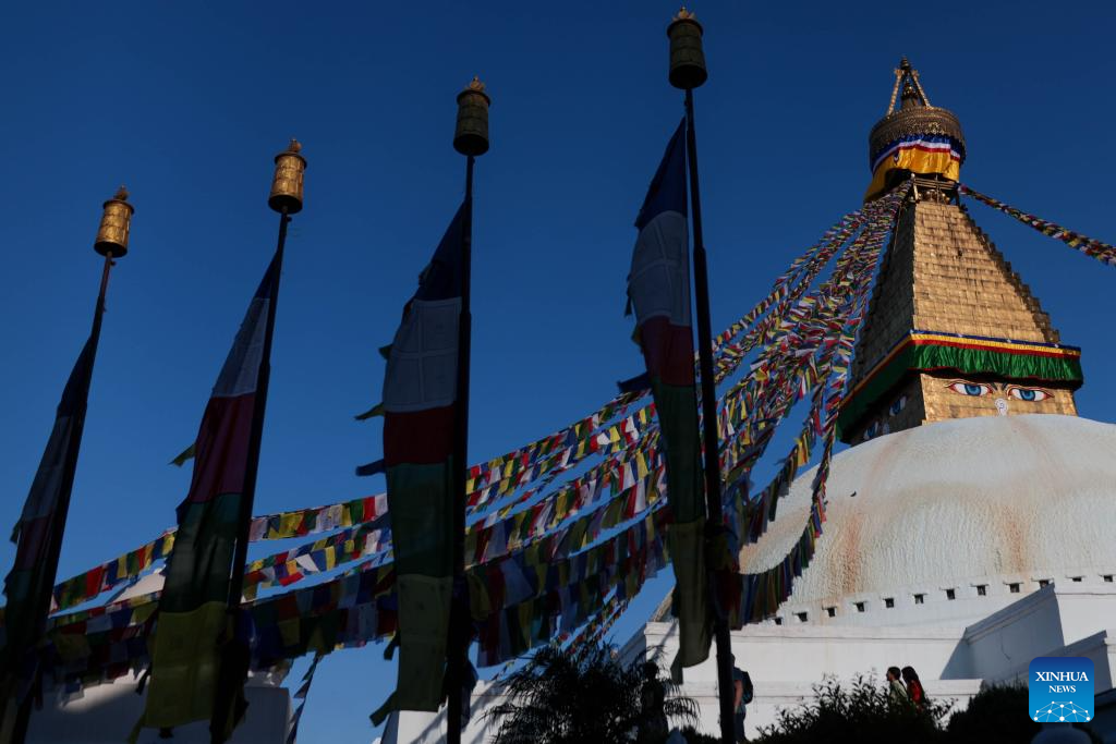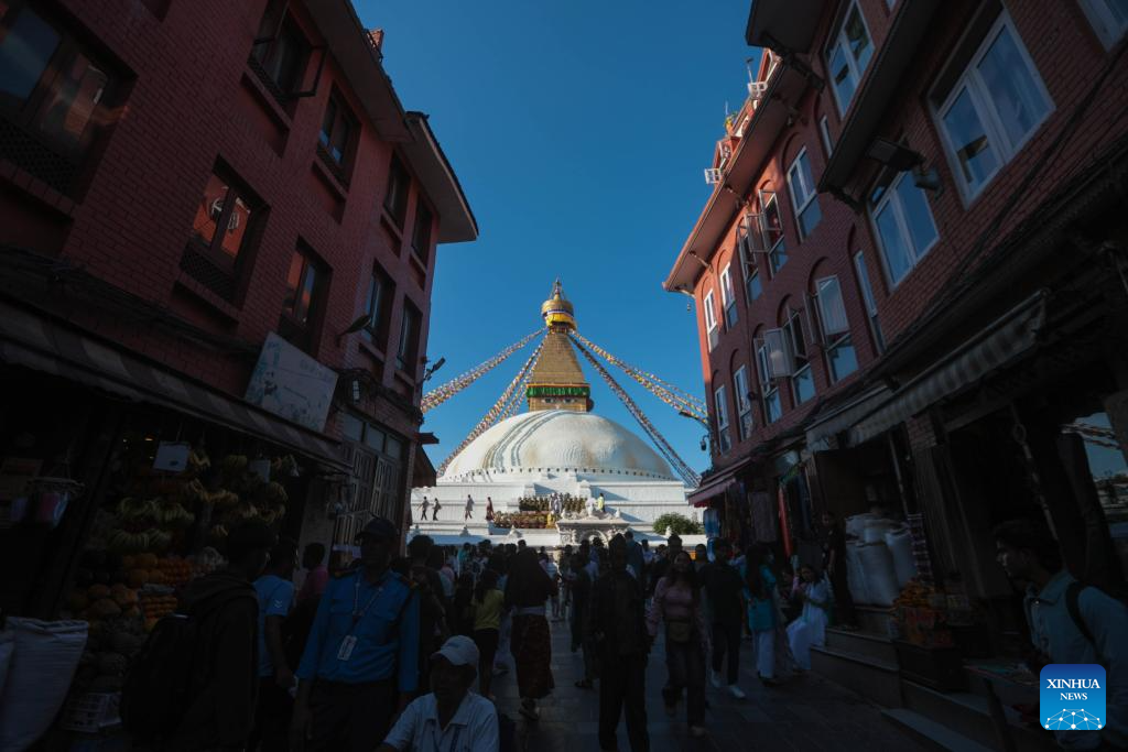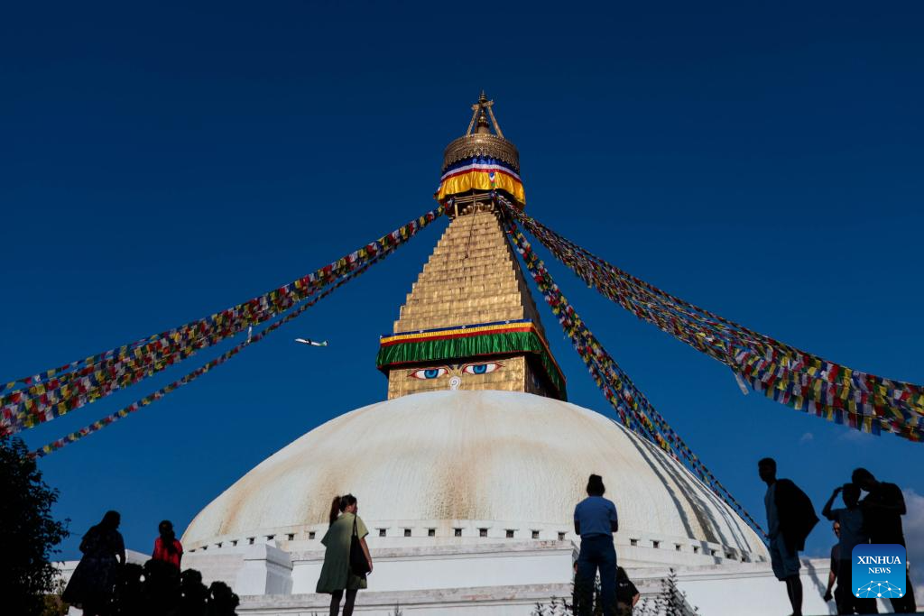 People visit Boudhanath Stupa, a UNESCO heritage site, in Kathmandu, Nepal, Sept. 7, 2024. (Photo by Sulav Shrestha/Xinhua)