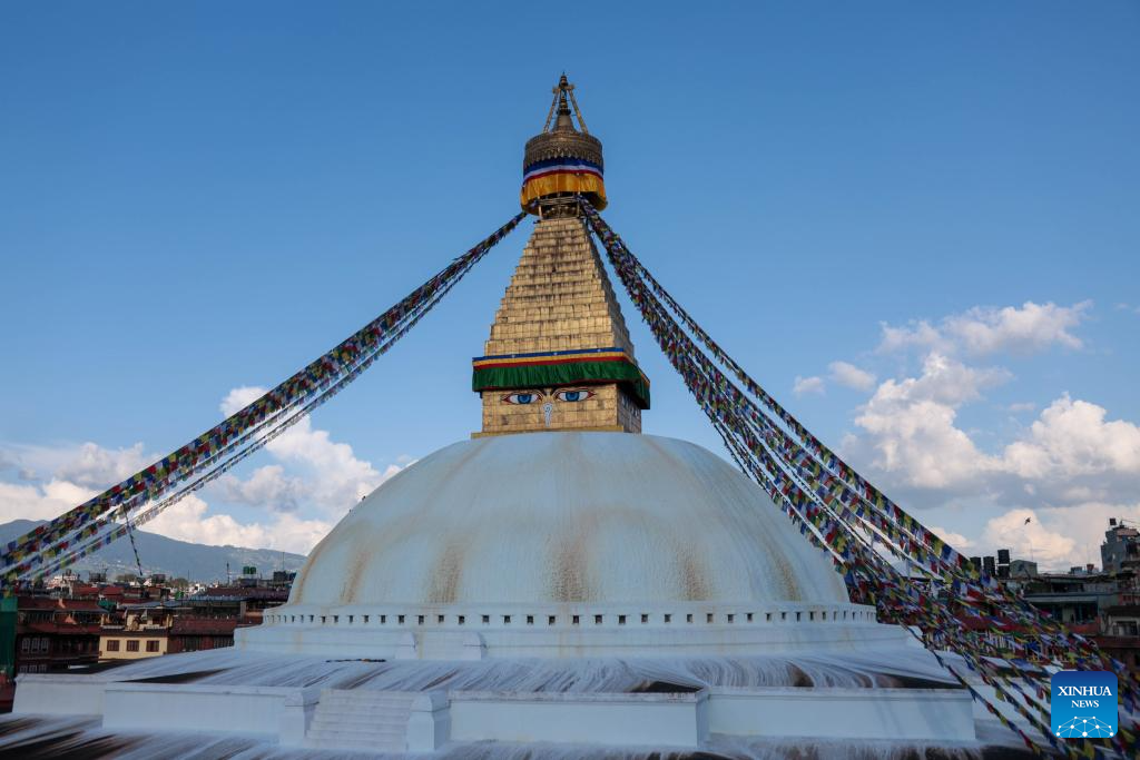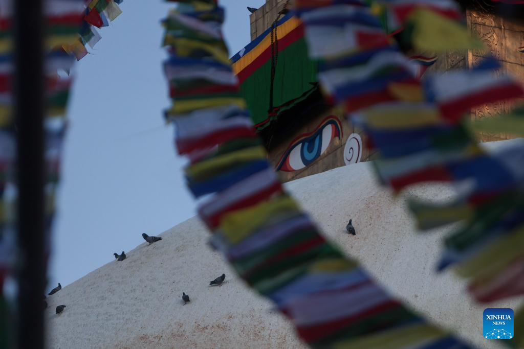 This photo taken on Sept. 7, 2024 shows part of Boudhanath Stupa, a UNESCO heritage site, in Kathmandu, Nepal. (Photo by Sulav Shrestha/Xinhua)