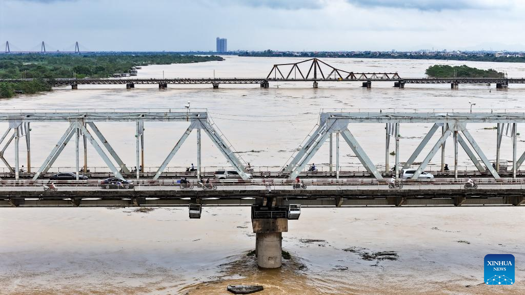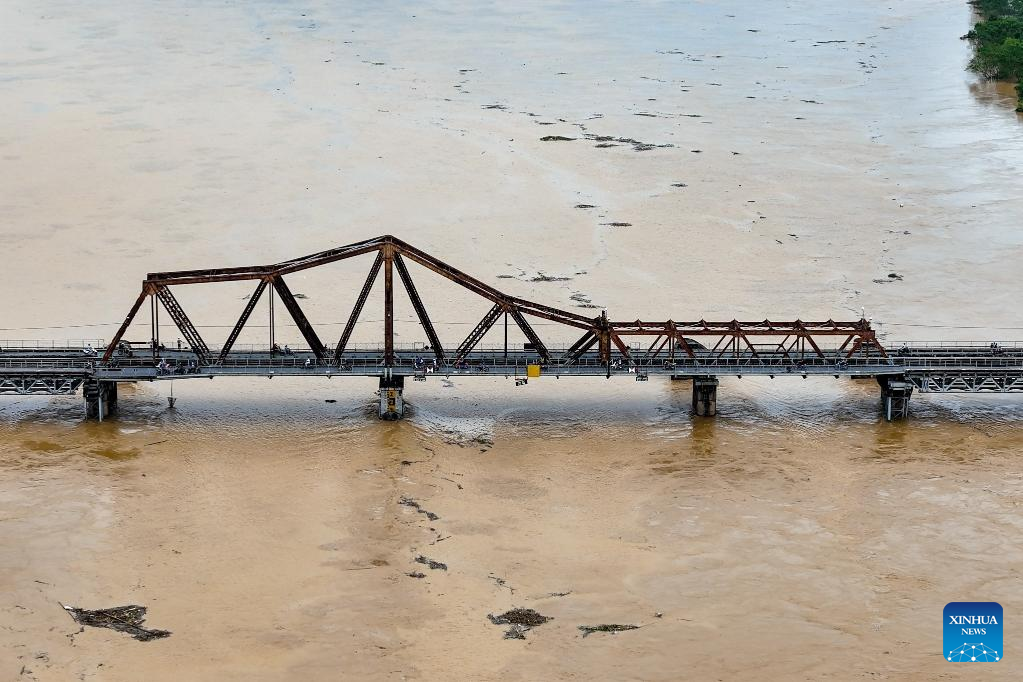 This photo taken on Sept. 10, 2024 shows Long Bien Bridge in Vietnam's capital Hanoi. As of Wednesday morning, Typhoon Yagi and the consequent landslides and floods had left 141 dead and 59 missing in Vietnam's northern region, the Ministry of Agriculture and Rural Development announced. (VNA via Xinhua)