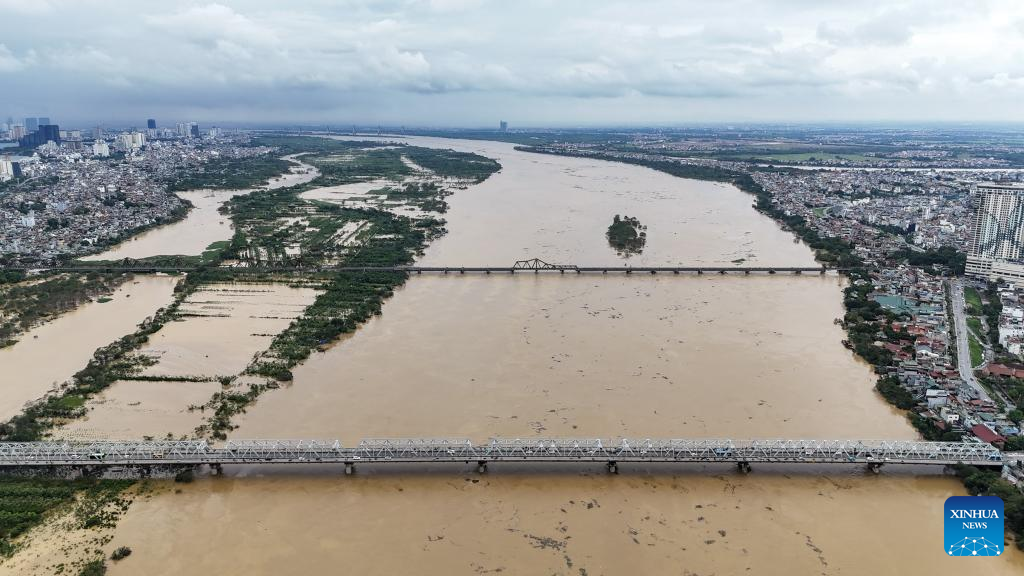 The water level of the Red River rises close to the bridge surface in Vietnam's capital Hanoi, Sept. 10, 2024. As of Wednesday morning, Typhoon Yagi and the consequent landslides and floods had left 141 dead and 59 missing in Vietnam's northern region, the Ministry of Agriculture and Rural Development announced. (VNA via Xinhua)
